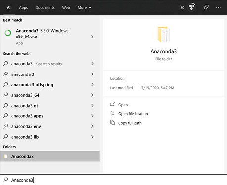 The shell script we need is located inside of the folder your Anaconda distribution added to your computer. If you remember where that is, you can navigate there using the File Explorer. If you don’t remember, the easiest way to find it is to use the search bar and search for “Anaconda3” and scroll down to the folders: