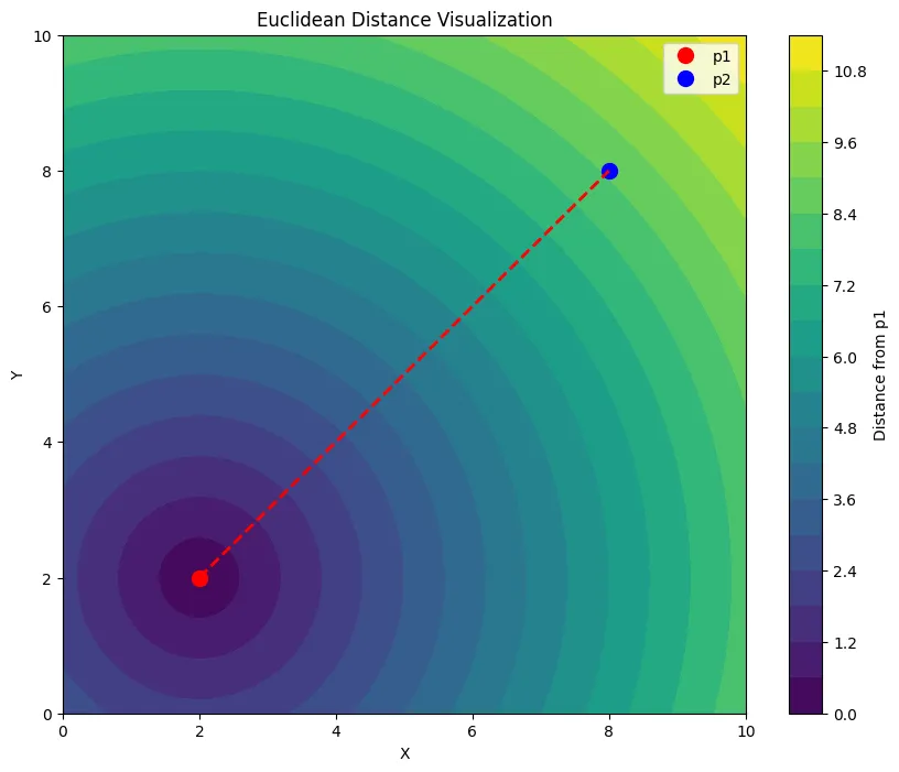 从熟悉的欧氏距离开始,一个经典的欧氏距离就是两点之间计算,公式如下: